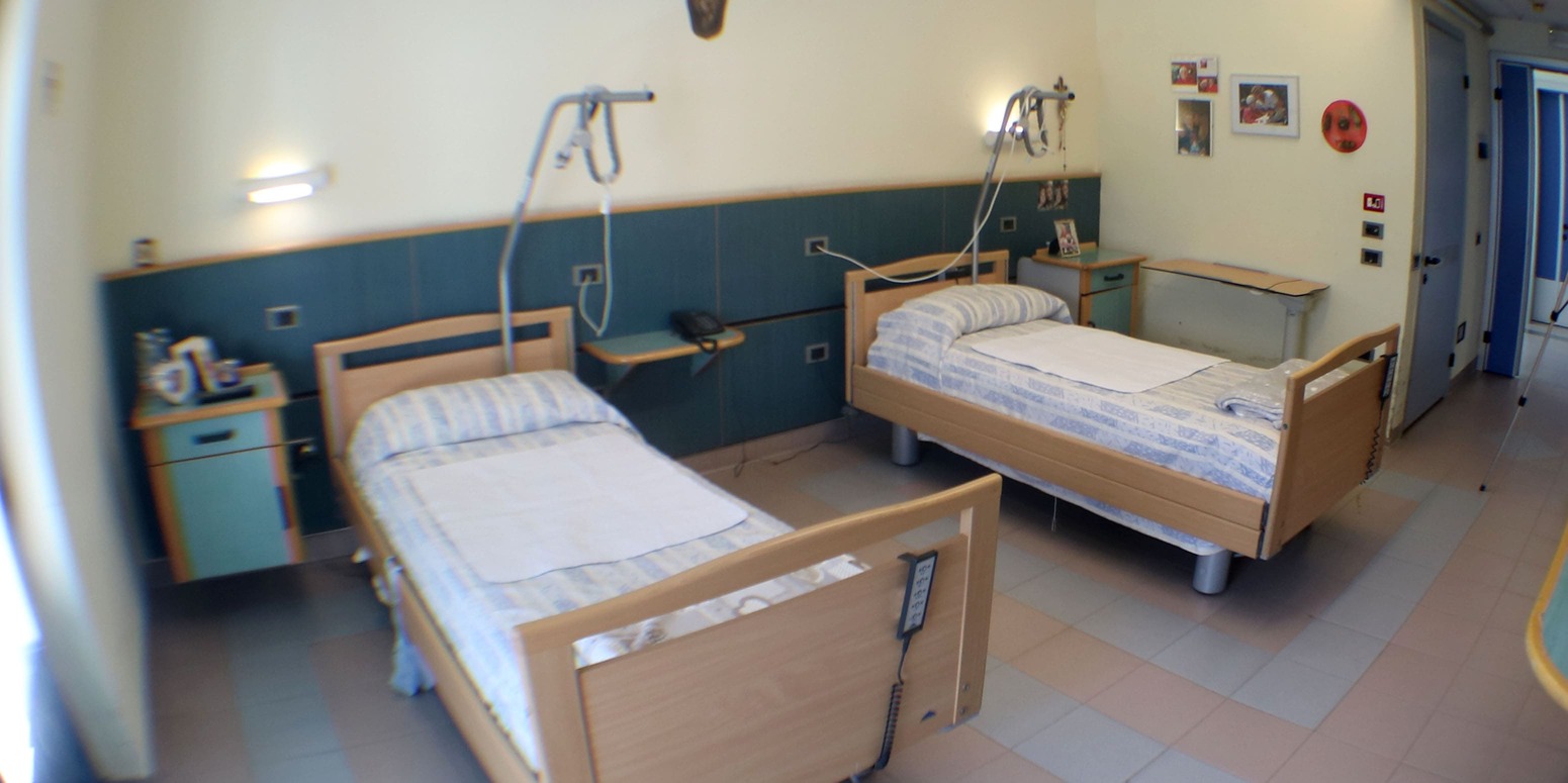 Le camere sono ad uno o due letti, con arredo idoneo alle esigenze di persone non autosufficienti, tutte dotate di bagno privato, telefono e impianto di chiamata. Le 32 camere singole e le 24 camere doppie sono distribuite tra il secondo e terzo livello. Ogni nucleo dispone di uno spazio soggiorno adeguato, un bagno assistito, un posto di controllo per il personale e locali per il deposito della biancheria.